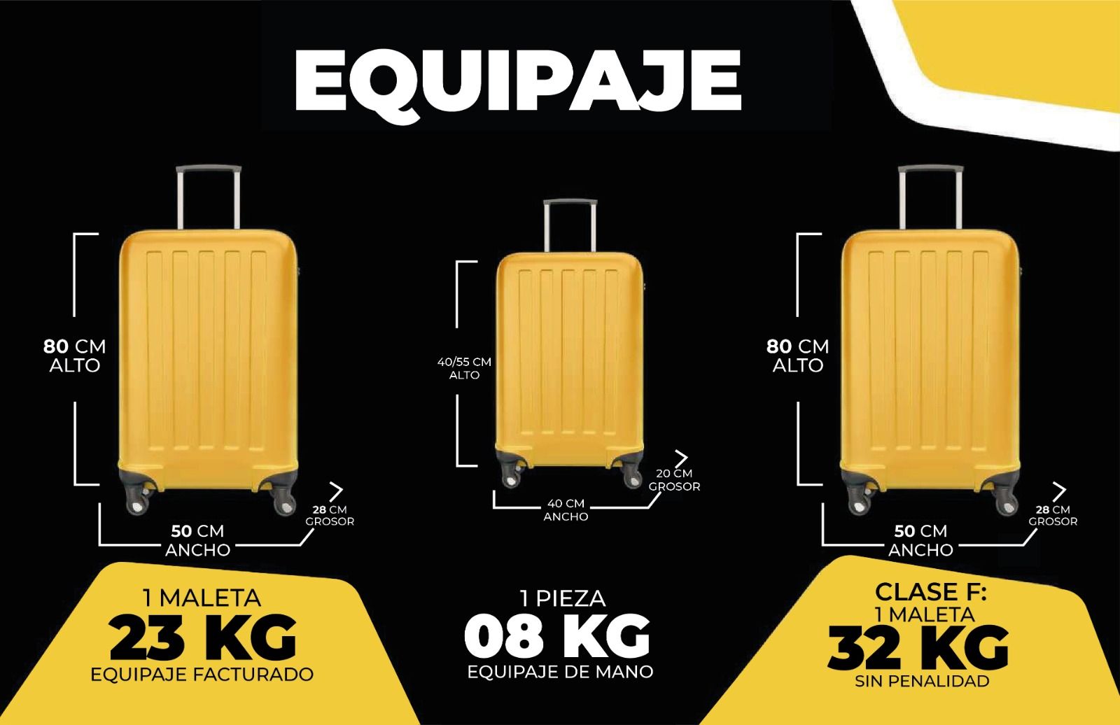 - Peso máximo permitido: Peso máximo de maleta facturada hasta 23 kg.